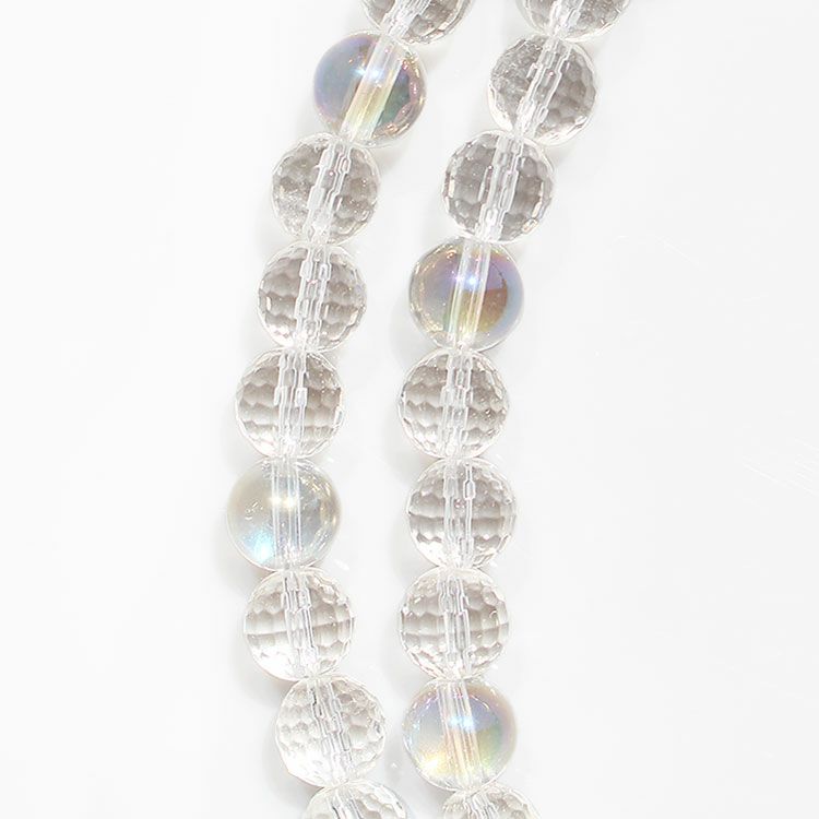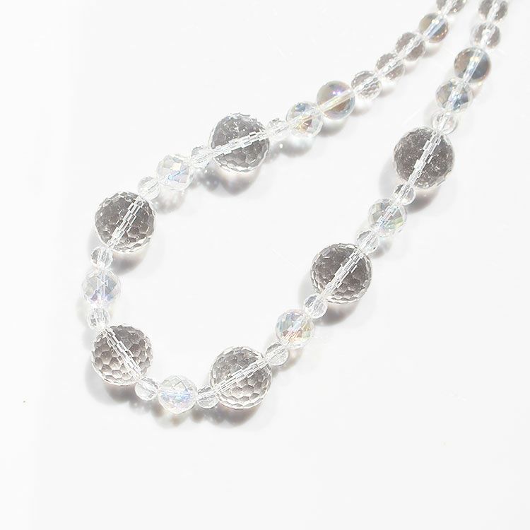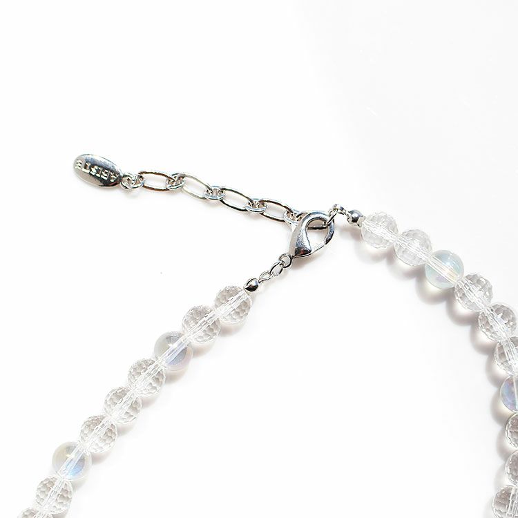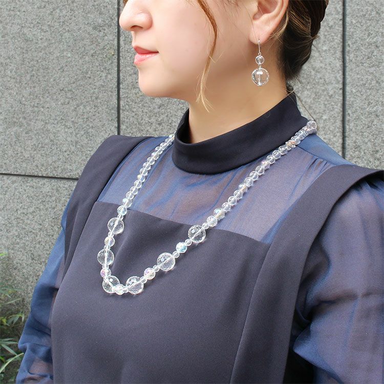 クォーツの中でも無色透明で純度の高い天然クォーツを使用したロック・クリスタル(本水晶)と、表面に虹彩被膜処理を行ったクォーツを組み合わせたロングネックレス。胸元でキラキラと輝き清楚感を漂わせています。