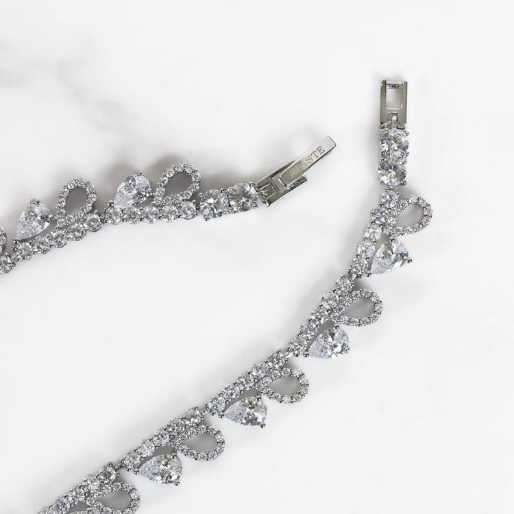 キュービックジルコニアは照明の下ではダイヤモンドを凌ぐほど煌めくので、ブライダルアクセサリーやステージアクセサリーとしてもおすすめの華やかなセットアクセサリーです。