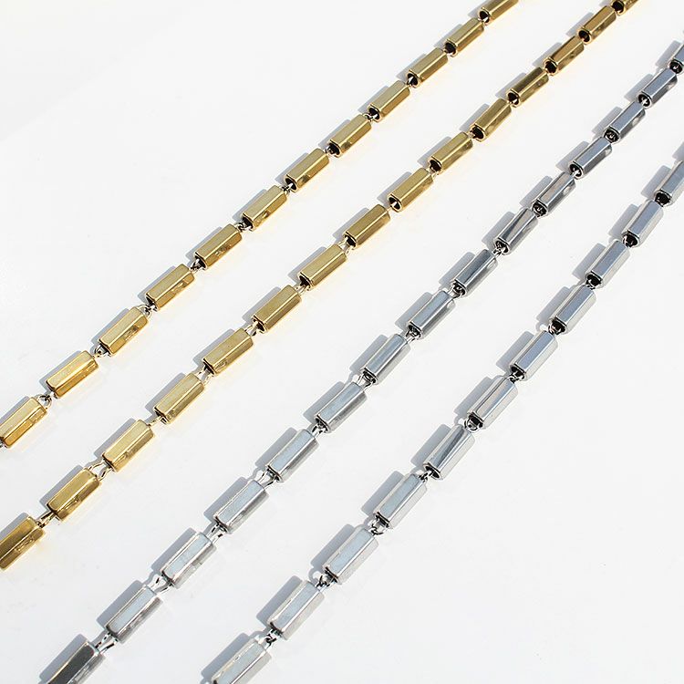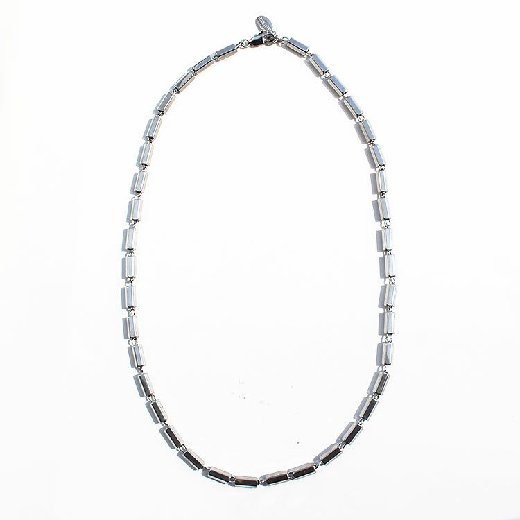 六角柱のメタルビーズを繋げたロングネックレス。洗練されたスタイリッシュなデザインは、女子会やお買い物はもちろん、オフィス使いやオケージョンシーン、パーティーシーンなど様々なシーンで活躍してくれるはず。