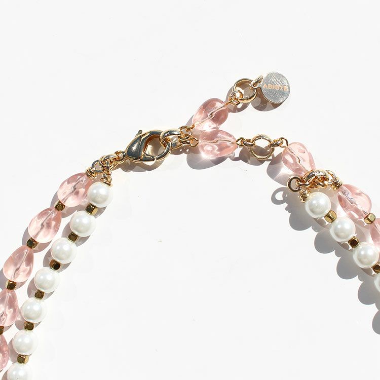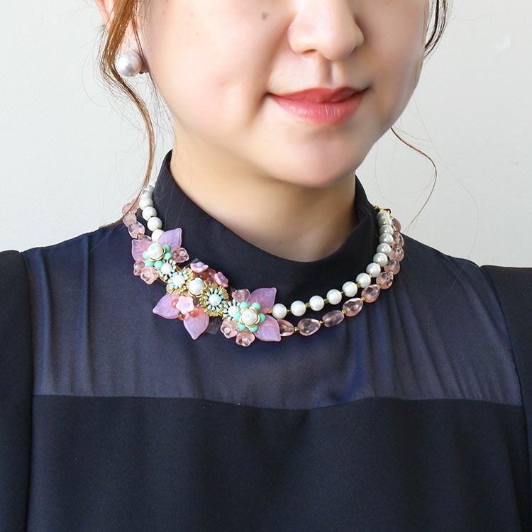 絶妙な色合いのフラワーモチーフに美しい光沢が魅力のガラスパールとチェコビーズが2連になったショートネックレス。パールやチェコビーズの間のゴールドパーツがアクセントになって、全体を雰囲気をキリっと引き締めています。正面のフラワーモチーフは複数のパーツを組み合わせた繊細なデザイン。お顔周りをより華やかに演出しています。パーティーや会食はもちろん、カジュアルなど幅広いシーンでご利用いただけます。