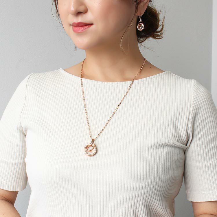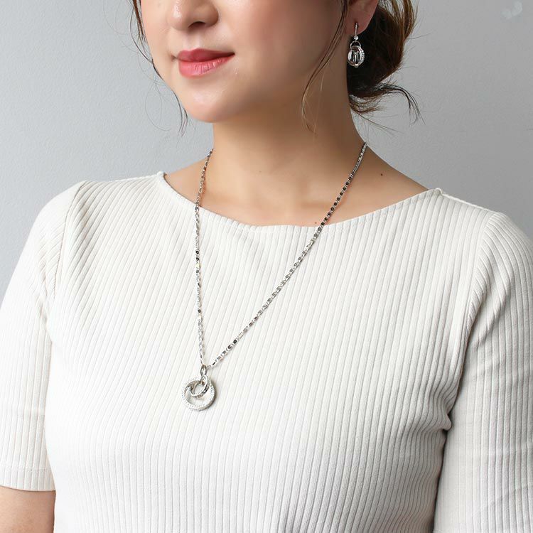大小2つのサークルモチーフをトップに配したペンダントネックレス。サークルモチーフには幾何学模様のレリーフと、側面には細かなビジューが散りばめられ、揺れるたびにキラキラと煌めきます。ペタルチェーンの細かな輝きが華やかさをプラスしています。
