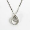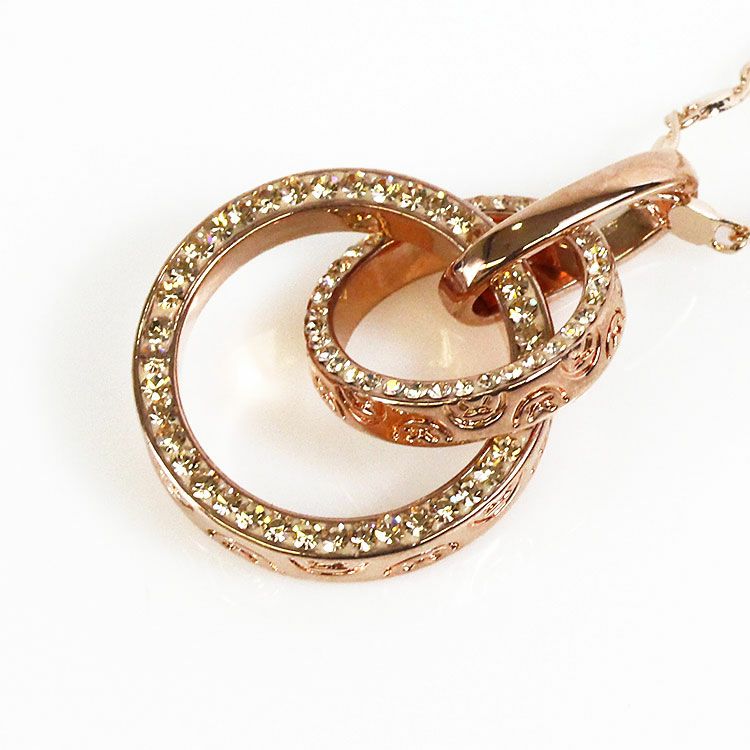 大小2つのサークルモチーフをトップに配したペンダントネックレス。サークルモチーフには幾何学模様のレリーフと、側面には細かなビジューが散りばめられ、揺れるたびにキラキラと煌めきます。ペタルチェーンの細かな輝きが華やかさをプラスしています。