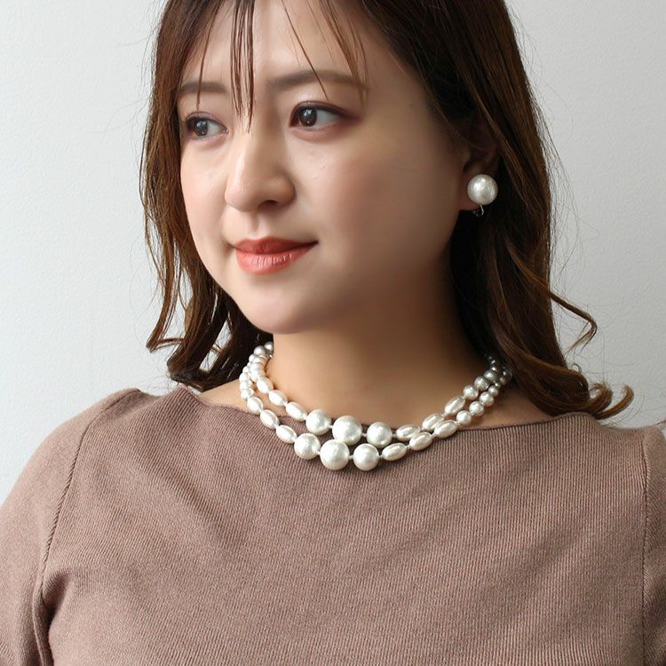 やさしげな肌触りと独特の風合いが魅力の、コットンパールネックレス。大小様々な形のパールを組み合わせたオシャレなデザインです。