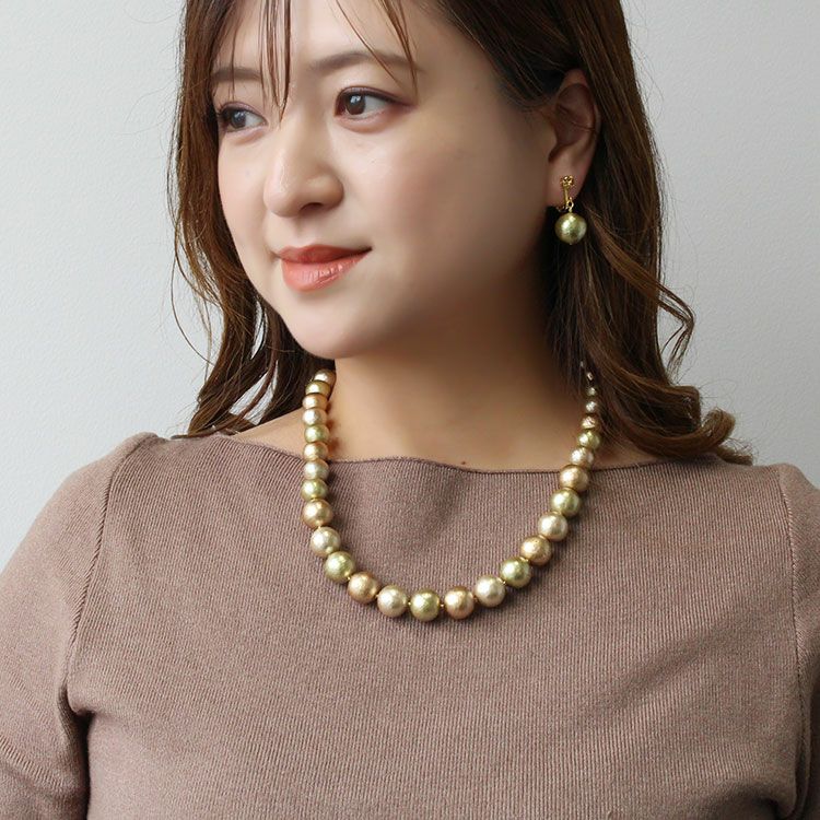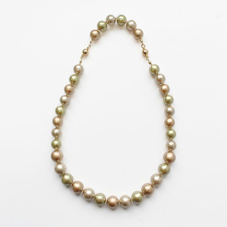 綿を圧縮して形成し、その上からパール塗装を施して作られるコットンパールは、繊維による細かい凹凸が特徴で、温かみのある質感を醸し出しています。驚くほどの軽さと、ひとつ一つが真円ではなく、少し歪んだ形状をしていることも、ナチュラルな魅力となっています。