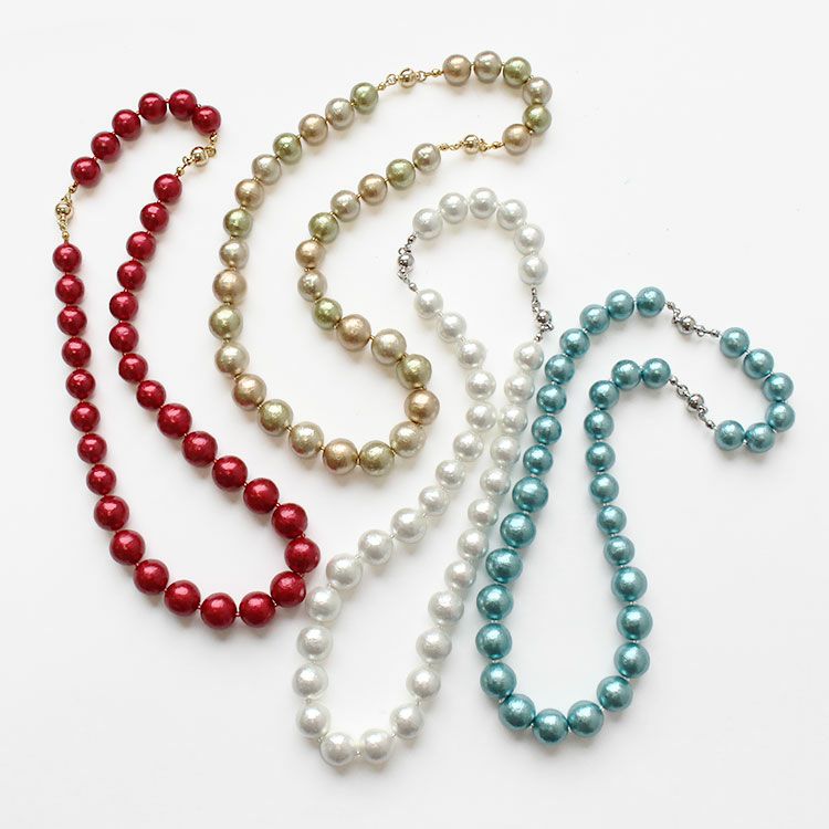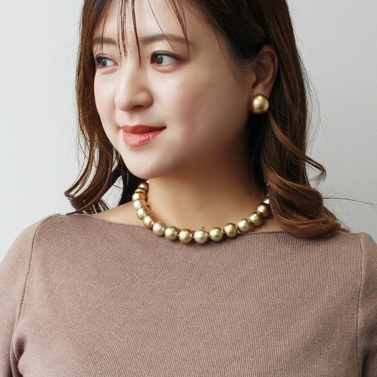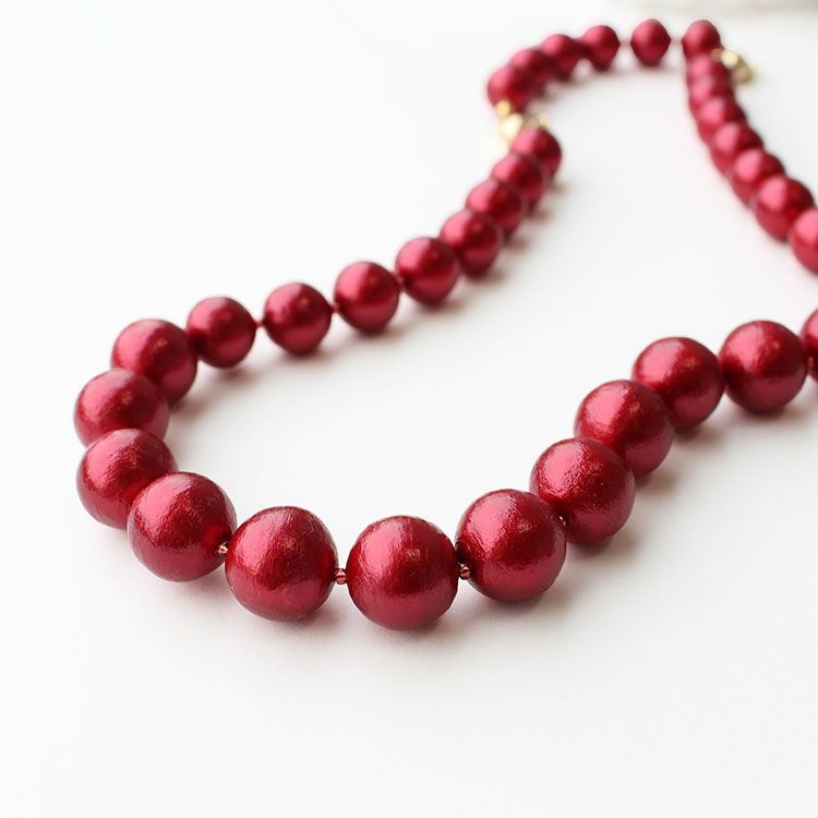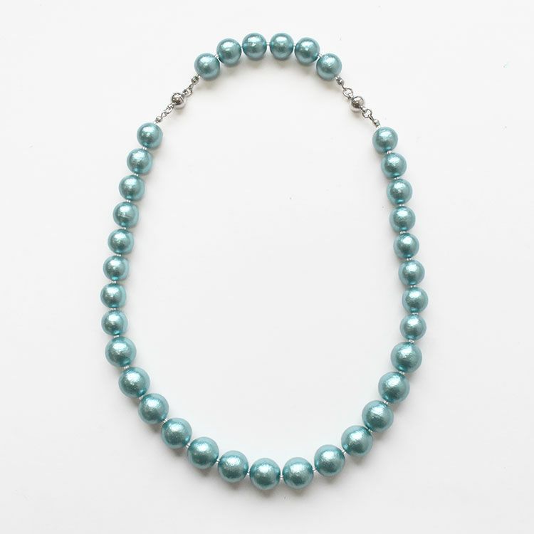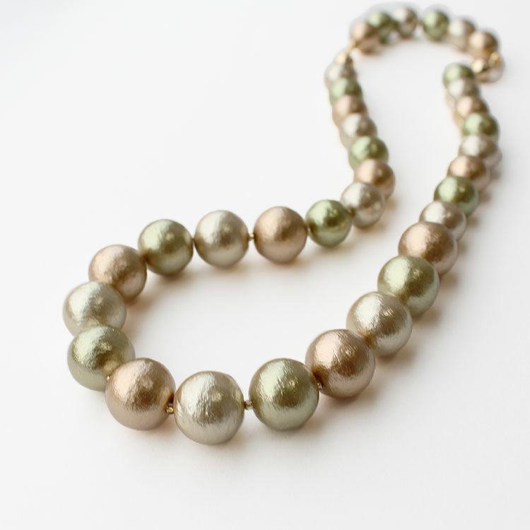 綿を圧縮して形成し、その上からパール塗装を施して作られるコットンパールは、繊維による細かい凹凸が特徴で、温かみのある質感を醸し出しています。驚くほどの軽さと、ひとつ一つが真円ではなく、少し歪んだ形状をしていることも、ナチュラルな魅力となっています。