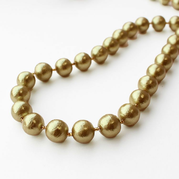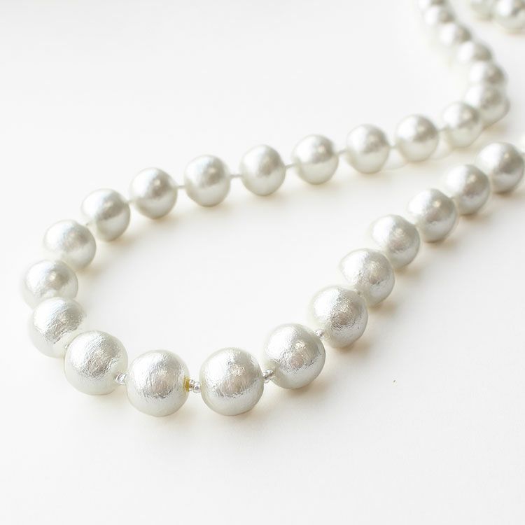 綿を圧縮して形成し、その上からパール塗装を施して作られるコットンパールは、繊維による細かい凹凸が特徴で、温かみのある質感を醸し出しています。驚くほどの軽さと、ひとつ一つが真円ではなく、少し歪んだ形状をしていることも、ナチュラルな魅力となっています。