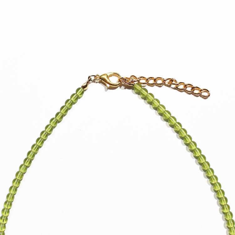 サイドには、透明感のある円盤型ビーズなどをバランスよく配し、日常使いしやすいとても軽快なネックレスに仕上がっています。