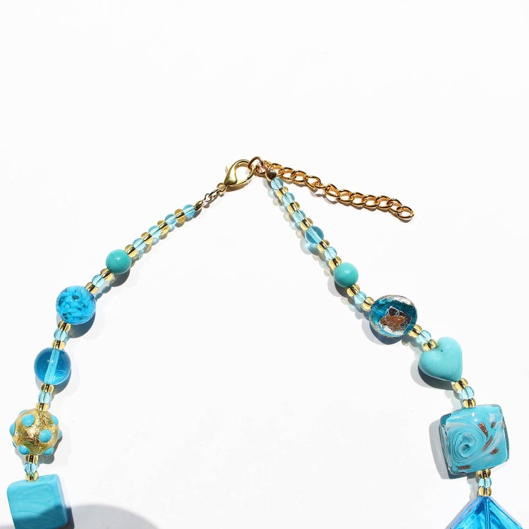 幾何学ビーズをターコイズブルートーンでまとめたオシャレなネックレス。 夏に相応しい透明感のあるビーズもあしらい洗練されたベネチアの世界感を表現しています。 技法は、ソンメルソ・オッキオ・ヴェッテ・ペスタッチョ・フィオーレを使用。 金箔と銀箔も様々な使い方を採用し、細部にわたり芸術性の高さが感じ取れる一品です。