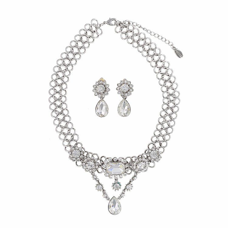 キラキラと煌めくビジューが華やかなショートネックレスとイヤリングのセット。存在感のある大粒のビジューが特別感を演出しています。パーティー、ブライダルジュエリーにふさわしいネックレス・イヤリングセットです。