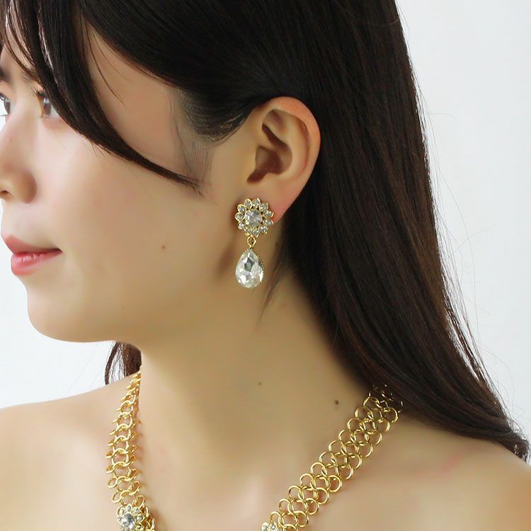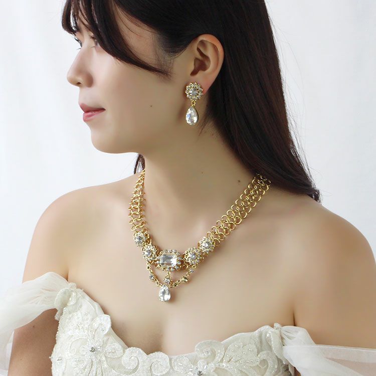 キラキラと煌めくビジューが華やかなショートネックレスとイヤリングのセット。存在感のある大粒のビジューが特別感を演出しています。パーティー、ブライダルジュエリーにふさわしいネックレス・イヤリングセットです。