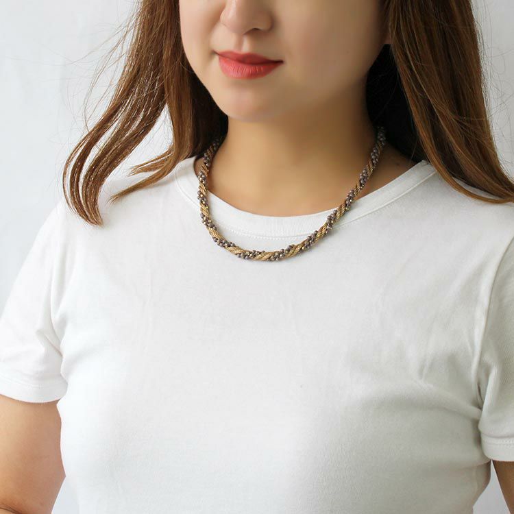 塗装を施したボールチェーンとメッシュチェーンを組み合わせたショートネックレス。チェーンにプリントされた箔がキラキラとさりげなく輝き大人っぽい印象に。