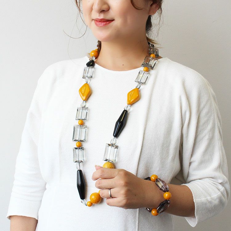 存在感のあるアクリルビーズを組み合わせた大ぶりのロングネックレス。重さはあるものの、着けた瞬間、重さが気にならなくなるほどしっくりくるオシャレ見えするデザインが魅力です。金属を使用していないためアレルギーの方も安心してご利用いただけます。