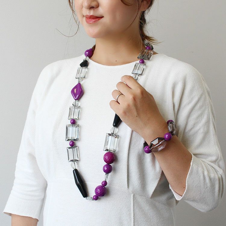 存在感のあるアクリルビーズを組み合わせた大ぶりのロングネックレス。重さはあるものの、着けた瞬間、重さが気にならなくなるほどしっくりくるオシャレ見えするデザインが魅力です。金属を使用していないためアレルギーの方も安心してご利用いただけます。