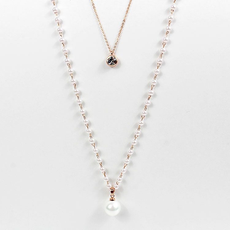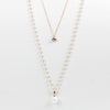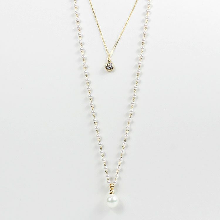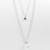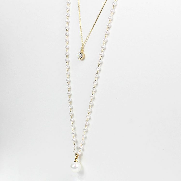 小さなパールネックレスにチェーンがレイヤードになったロングネックレス。パールネックレスには大粒のシェルパールがアクセントに。チェーンにはキュービックジルコニアが煌めき、華やな印象を与えています。軽くて使いやすいので、デイリーからオケージョン、フォーマルまで、幅広くご利用いただけます。