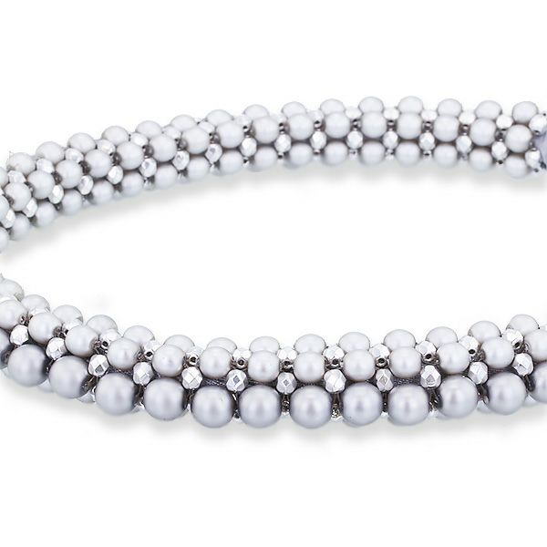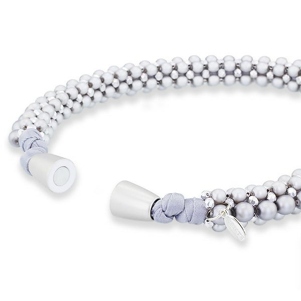優しい印象のベージュにクリスタルガラスの輝きが上品さをプラスしてくれるショートネックレス。着脱がとても簡単なマグネットリンクがおすすめポイントです。ショートタイプなのでシャツの襟からのぞかせてもステキです。
