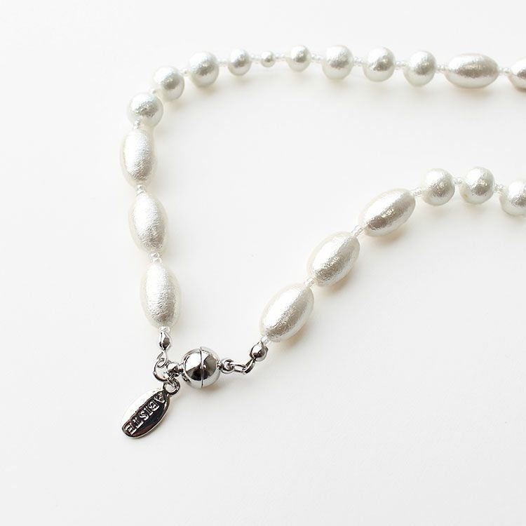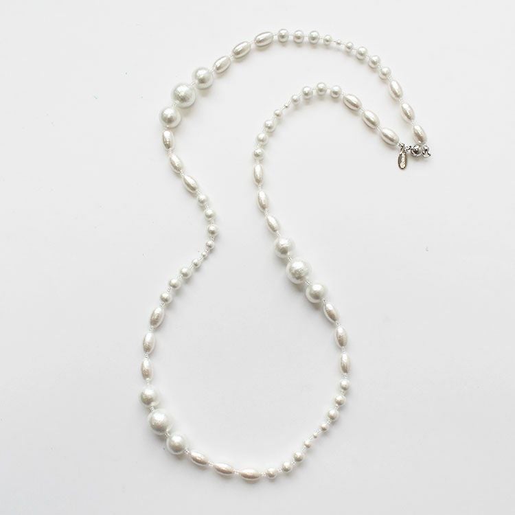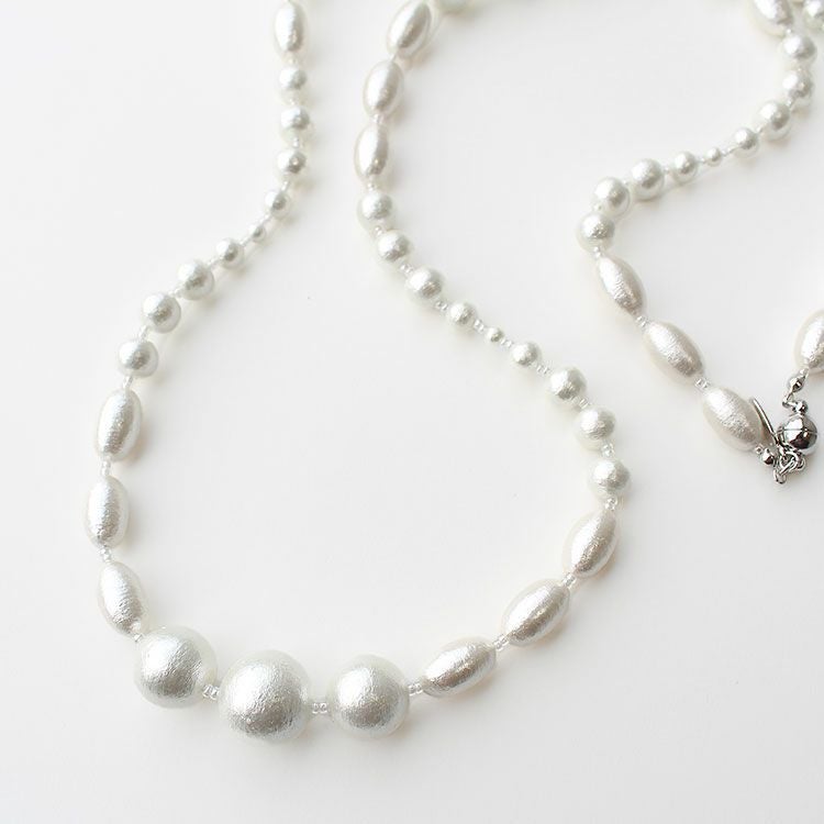 やさしげな肌触りと独特の風合いが魅力の、コットンパールネックレス。大小様々な形のパールを組み合わせたオシャレなデザインです。