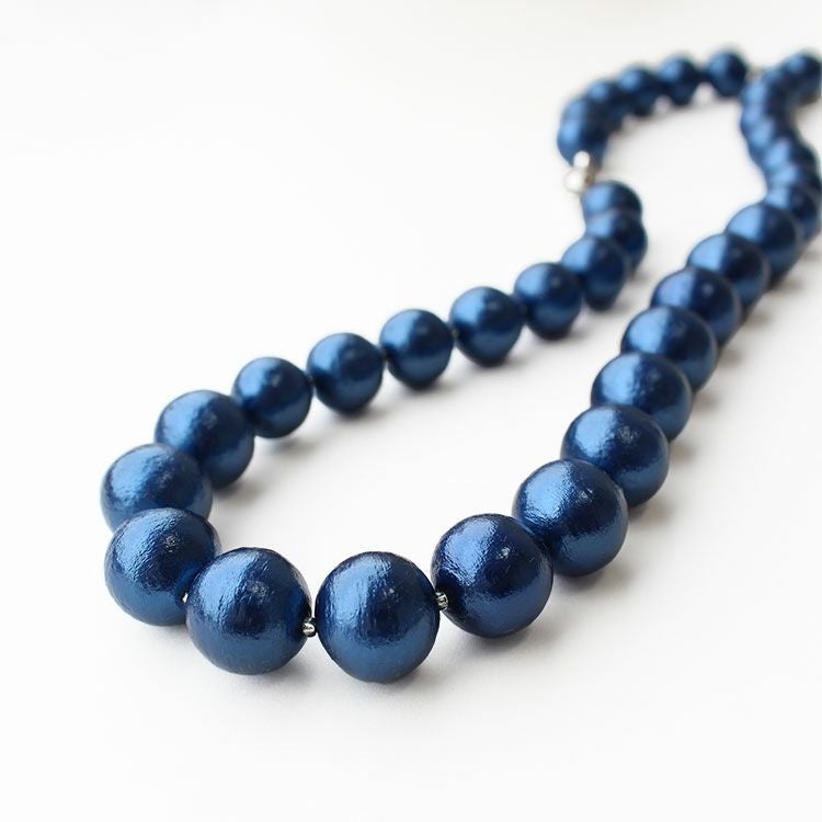 綿を圧縮して形成し、その上からパール塗装を施して作られるコットンパールは、繊維による細かい凹凸が特徴で、温かみのある質感を醸し出しています。驚くほどの軽さと、ひとつ一つが真円ではなく、少し歪んだ形状をしていることも、ナチュラルな魅力となっています。