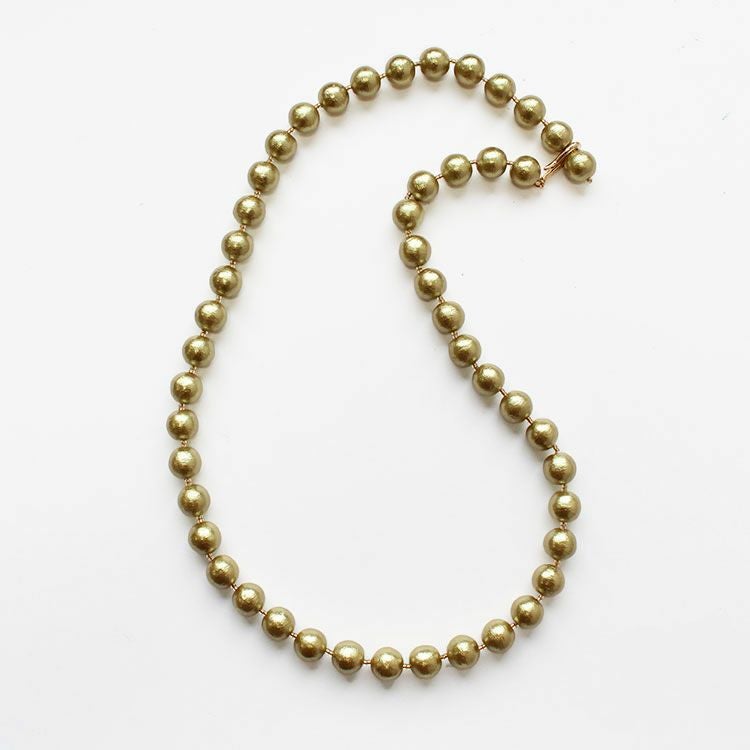 綿を圧縮して形成し、その上からパール塗装を施して作られるコットンパールは、繊維による細かい凹凸が特徴で、温かみのある質感を醸し出しています。驚くほどの軽さと、ひとつ一つが真円ではなく、少し歪んだ形状をしていることも、ナチュラルな魅力となっています。