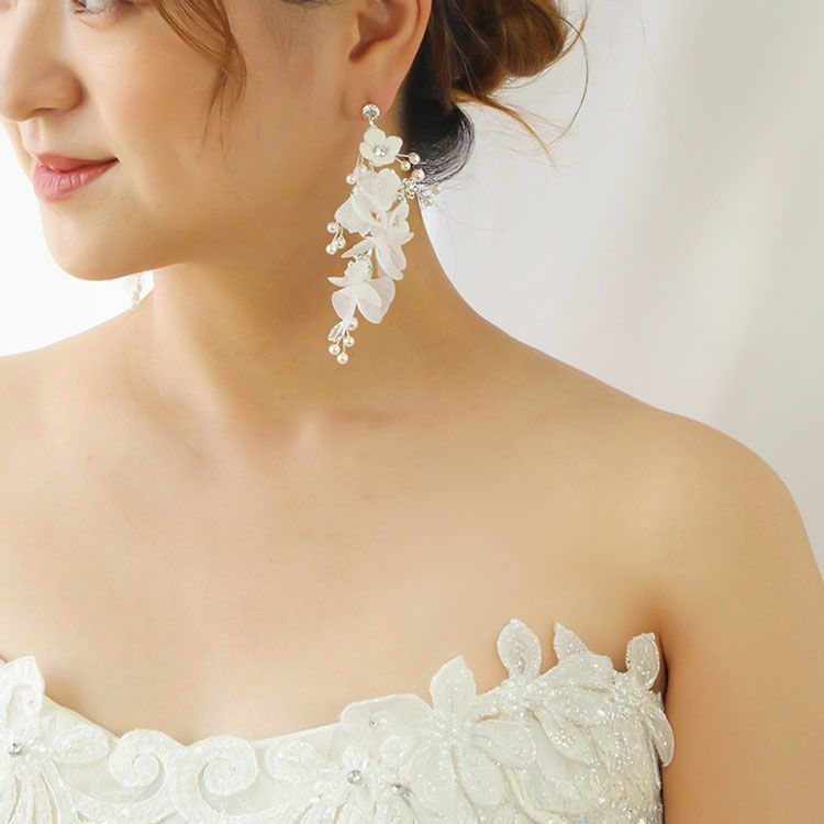 ワイヤーでパールやフラワーモチーフを繋げた、ブライダルアクセサリーとして人気の小枝アクセサリー。大ぶりなので一つ着けるだけでもとても華やかな印象に。結婚式だけでなく、ワンピースやあえてカジュアルなデニムスタイルに合わせて日常に取り入れても素敵です。
