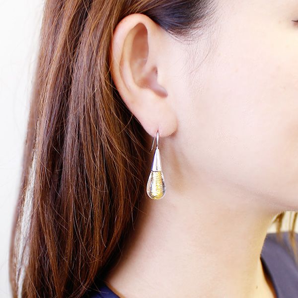 ベネチアンガラスと上質な素材を使用した、大人の魅力を引き立てるピアス。ベネチアンガラスのトップにはSV999銀箔を使用したソンメルソという技法を用い、奥深い光を放ちます。細身のフォルムは顔周りをスッキリと見せる効果があるのも嬉しいポイント。