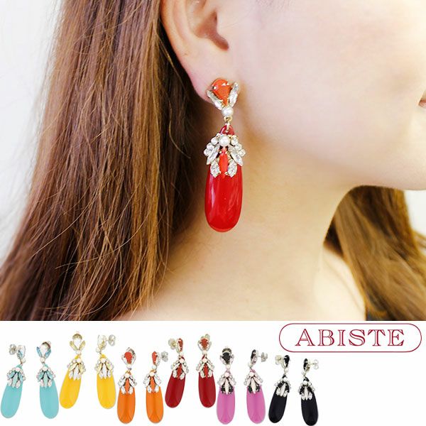 ティアドロップ型のパーツに大粒のクリスタルガラスをあしらったビジューピアス。