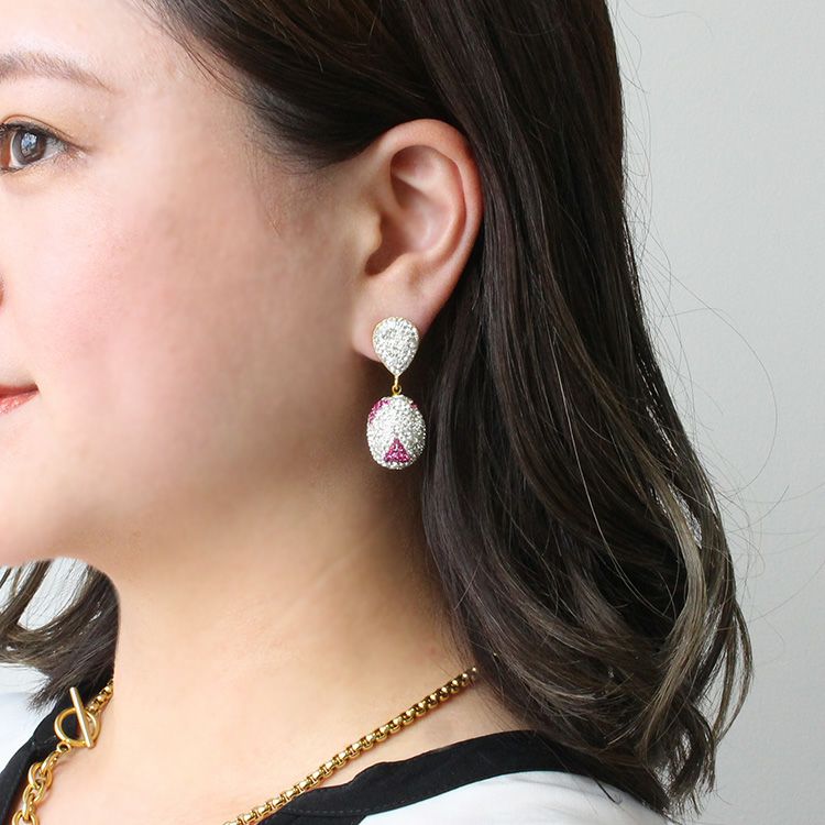 クリスタルガラスがたっぷりとあしらわれ、動くたび、光がわずかに当たるたびにキラキラと煌めくピアス。