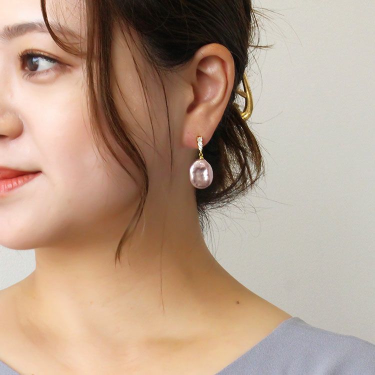 煌めくクリスタルガラスに平ドロップ型の淡水パールが揺れるピアス。やわらかい光沢感と天然ならではの色合いが特徴です。パーティーシーンや会食、外出時、デイリー等幅広くご利用いただけます。