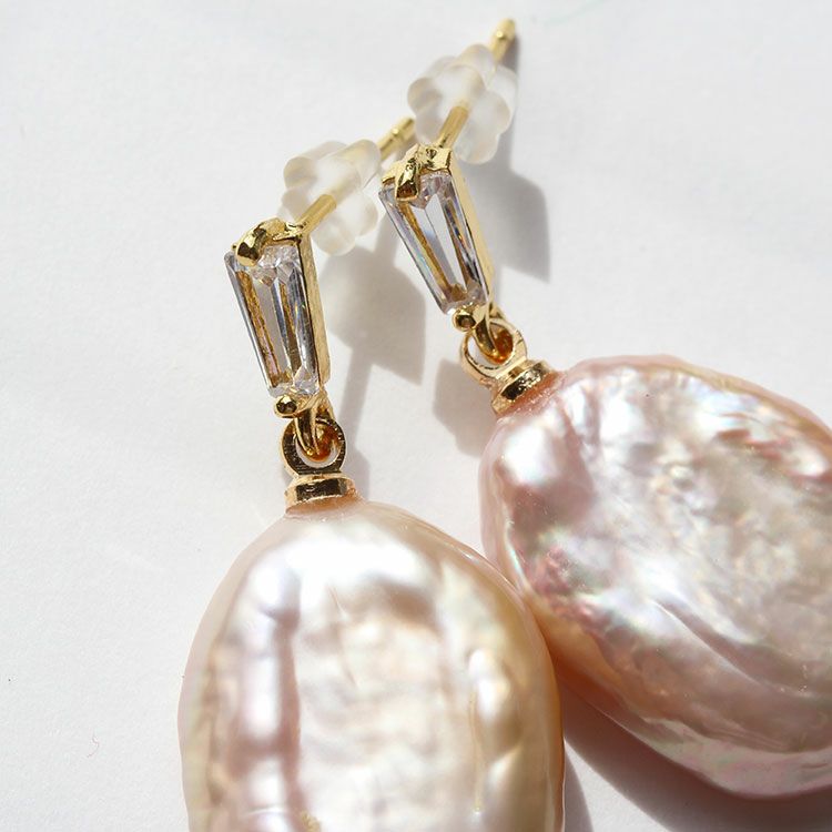 煌めくクリスタルガラスに平ドロップ型の淡水パールが揺れるピアス。やわらかい光沢感と天然ならではの色合いが特徴です。パーティーシーンや会食、外出時、デイリー等幅広くご利用いただけます。