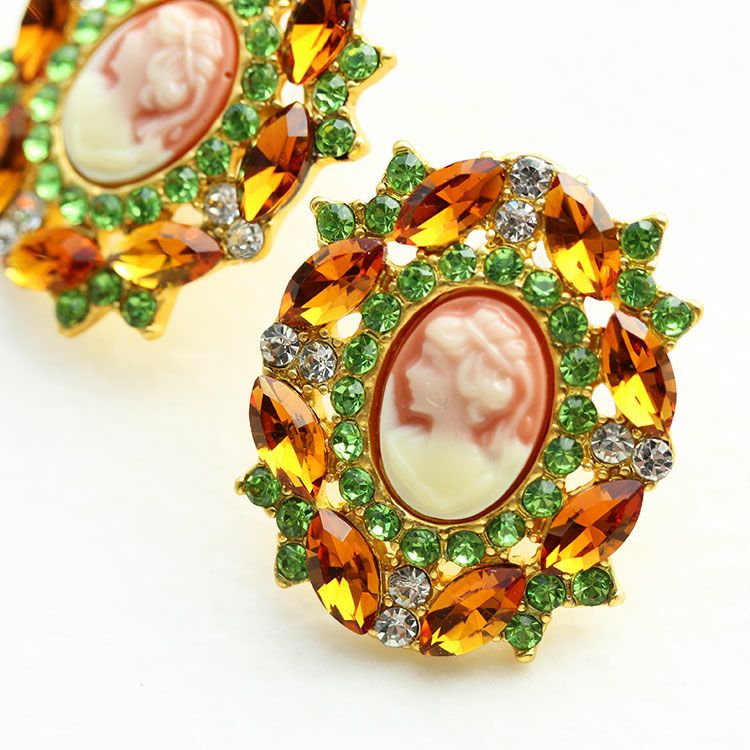 落ち着いたシックな色合いがおしゃれなアンティーク調のデザインピアス。カメオと煌めくクリスタルガラスがエレガントなデザインです。パーティーシーンや会食、外出時はもちろん、普段使いにもご利用いただけます。