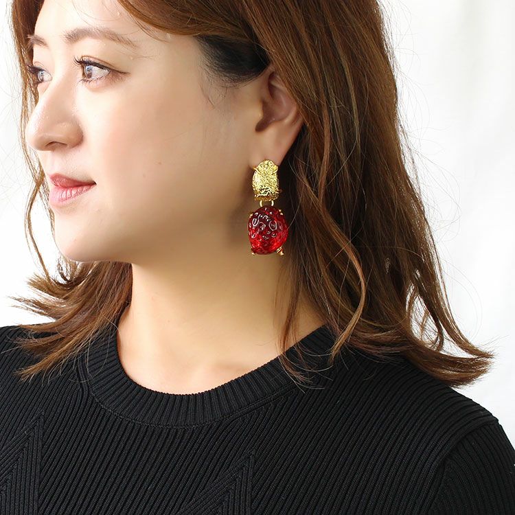 イチゴの果肉のようなモチーフが印象的なアンティーク調デザインロングピアス。遊びゴコロあふれる大ぶりのデザインはコスチュームジュエリーならでは。パーティーシーンや会食、外出時はもちろん、普段使いに、コーディネートのアクセントにご利用ください。