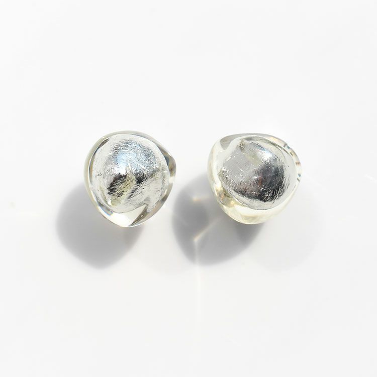 アートのような変形したフォルムがニュアンスのあるレジンピアス。キラキラと光を反射するレジンに銀箔、金箔がアクセントになって、ラグジュアリーで、モードな雰囲気を印象付けています。どの角度から見てもこなれ感あるデザインは、デイリー使いはもちろん、パーティーシーンにもおすすめです。