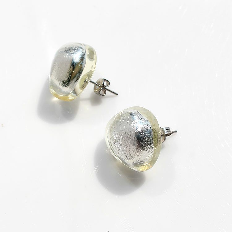 アートのような変形したフォルムがニュアンスのあるレジンピアス。キラキラと光を反射するレジンに銀箔、金箔がアクセントになって、ラグジュアリーで、モードな雰囲気を印象付けています。どの角度から見てもこなれ感あるデザインは、デイリー使いはもちろん、パーティーシーンにもおすすめです。