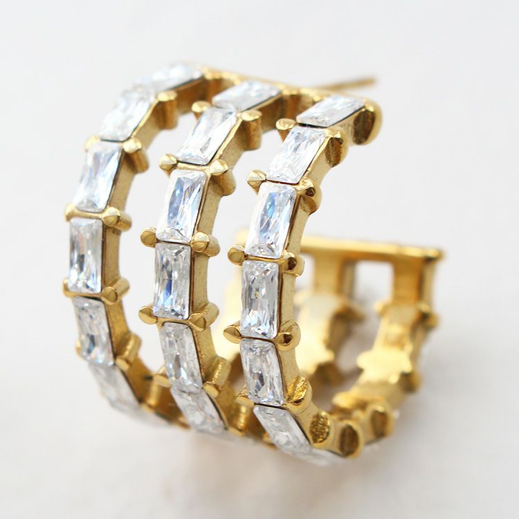 レクタングルキュービックジルコニアを連ねた、シンプルでありながらも華やかなフープピアス。流行や年代にとらわれずに使いやすいデザインで、かつ合わせる洋服や使うシーンを選ばないので、持っておくと重宝するアイテム。