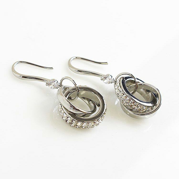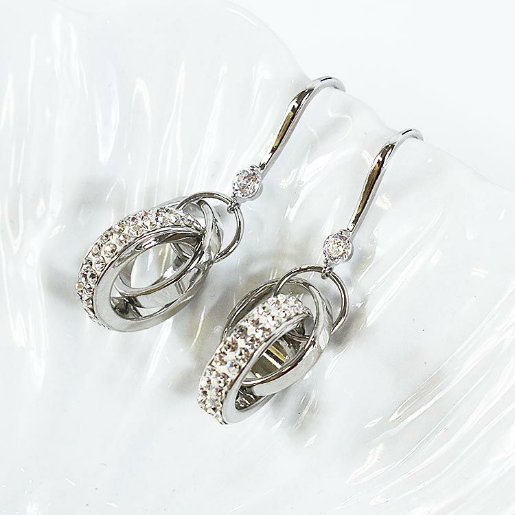 大小2つのサークルモチーフを配したピアス。大きなサークルモチーフの側面には細かなクリスタルガラスが散りばめられ、揺れるたびにキラキラと煌めきます。フック式留め具の付け根には、一粒のクリスタルガラスが、耳元を上品な雰囲気を演出。パーティーシーンはもちろん、お仕事や普段使いにと、幅広いシーンで活躍してくれます。
