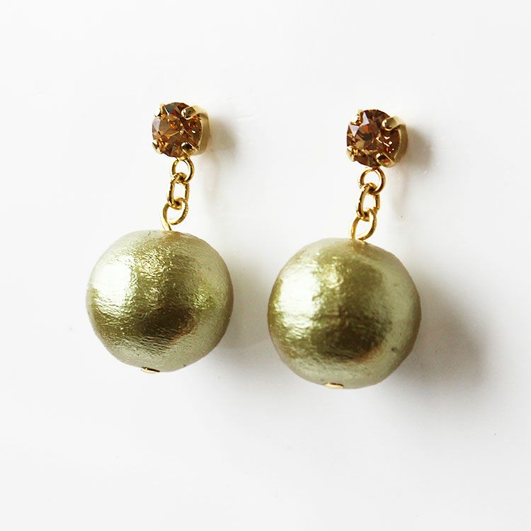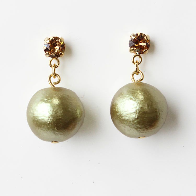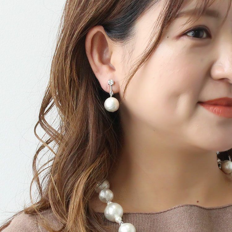やさしげな肌触りと独特の風合いが魅力の、コットンパールのデザインピアス。ビジューがついた華やかなデザインは、パーティーからデイリーまで幅広くご使用いただけます。