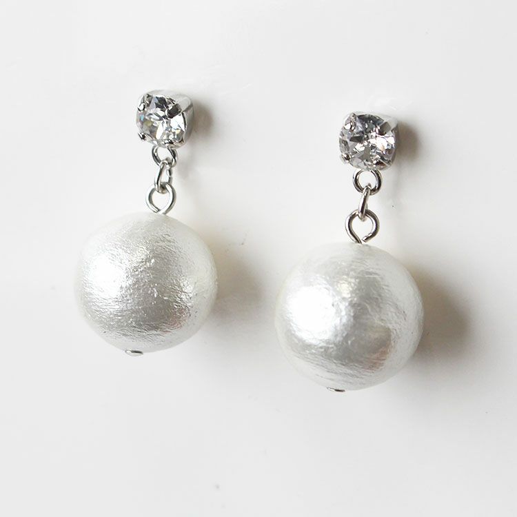 やさしげな肌触りと独特の風合いが魅力の、コットンパールのデザインピアス。ビジューがついた華やかなデザインは、パーティーからデイリーまで幅広くご使用いただけます。