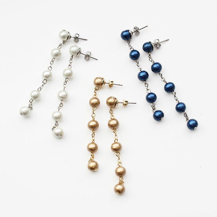 綿を圧縮して形成し、その上からパール塗装を施して作られるコットンパールは、繊維による細かい凹凸が特徴で、温かみのある質感を醸し出しています。驚くほどの軽さと、ひとつ一つが真円ではなく、少し歪んだ形状をしていることも、ナチュラルな魅力となっています。