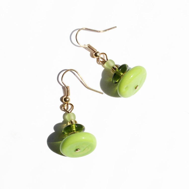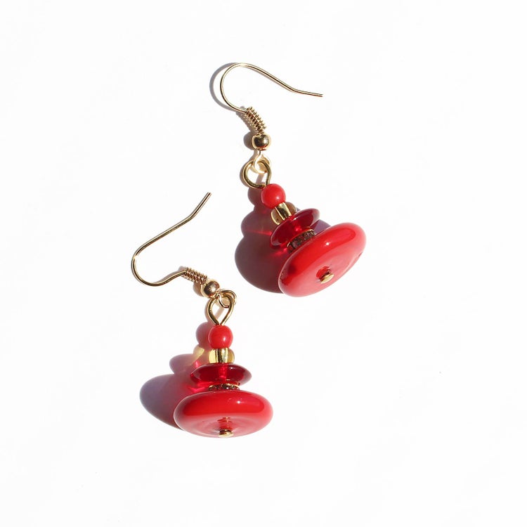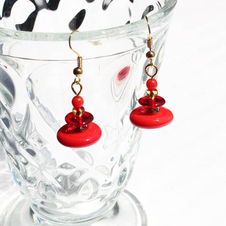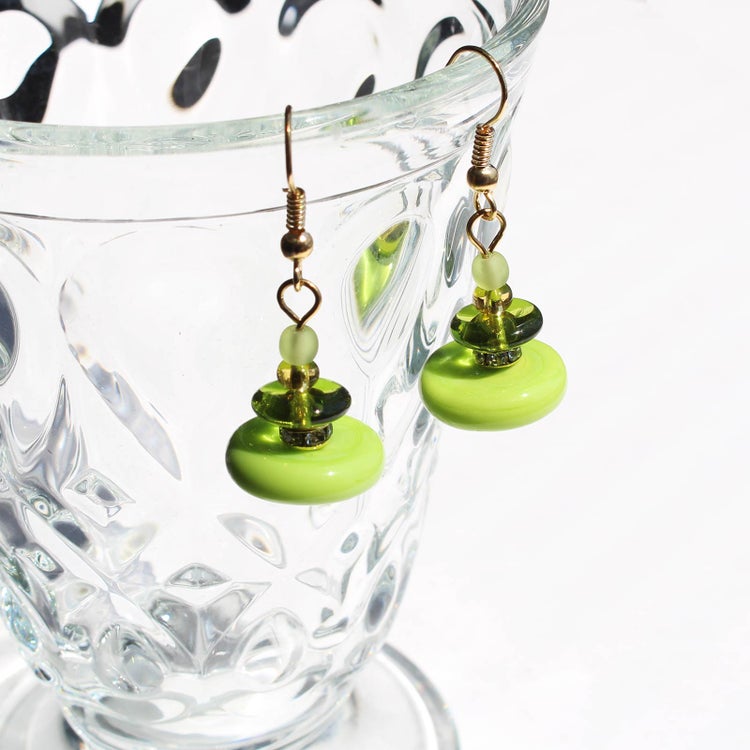 耳元で軽やかにスイングするような、円盤型のビーズが愛らしいデザインのフックピアス。ベネチアンならではの鮮やかで美しい色味がポイントです。 大小の丸玉ビーズの間にはキラリと煌めくクリスタルガラスが配置され、華やかなデザインです。
