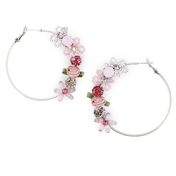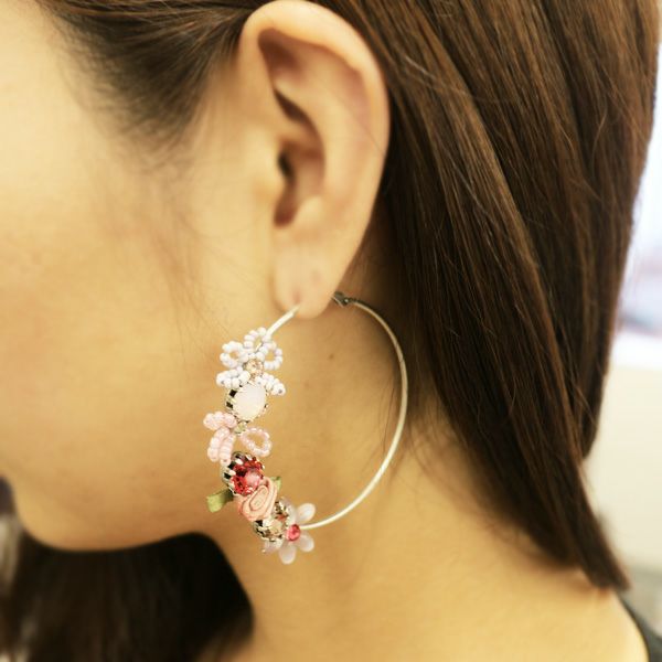 リボンやビーズなどの素材で作られたフラワーモチーフが飾る大きなフープピアス。3色の大粒クリスタルガラスが華やかさを一層させてくれます。