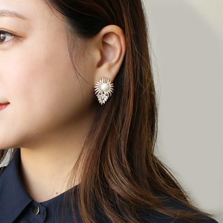 キュービックジルコニアリーフモチーフパールピアス/3190048