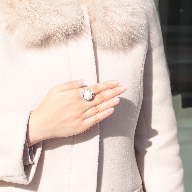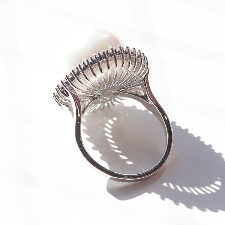 キュービックジルコニアがあしらわれたパールデザインリング。大粒のパールがエレガントな印象をプラスし、大人の装いにしっくりとなじみます。