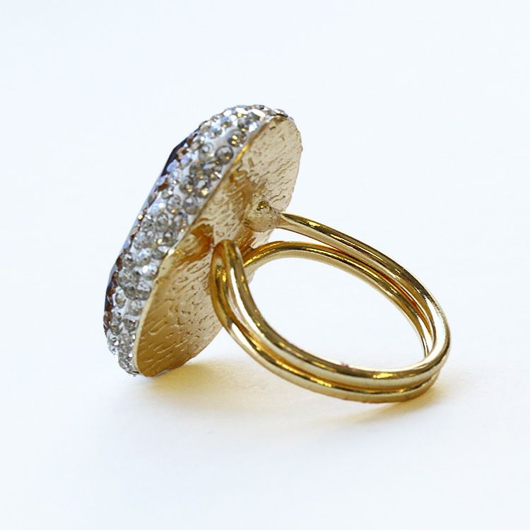 大ぶりの人工キャッツアイの周りにクリスタルガラスをあしらったビジューリング。大ぶりながらもエレガントな印象で、手元に華やかさをプラスしてくれます。