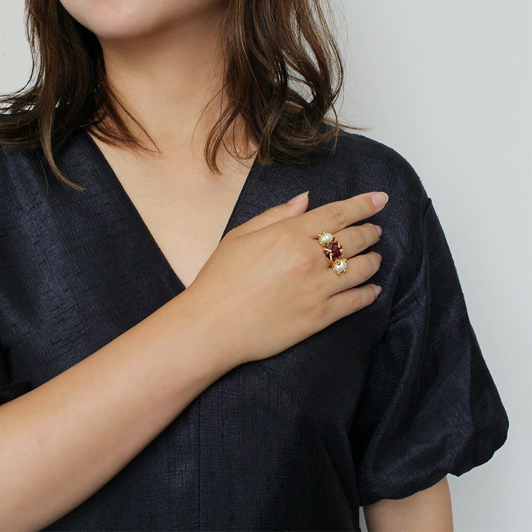 ガーネットのような深みのあるカラーにペインティング処理を施したルビーに、淡水パールで柔らかな印象をプラスしたリング。リングトップは幅が広く華やかなデザインながらも、リング部分が細いので圧迫感なくお着けいただけます。