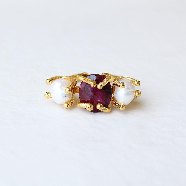 ガーネットのような深みのあるカラーにペインティング処理を施したルビーに、淡水パールで柔らかな印象をプラスしたリング。リングトップは幅が広く華やかなデザインながらも、リング部分が細いので圧迫感なくお着けいただけます。