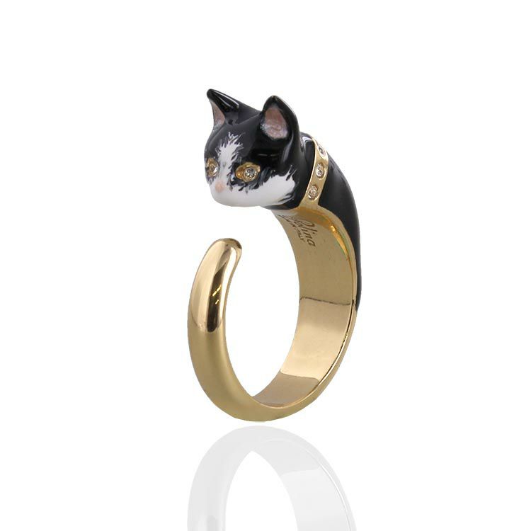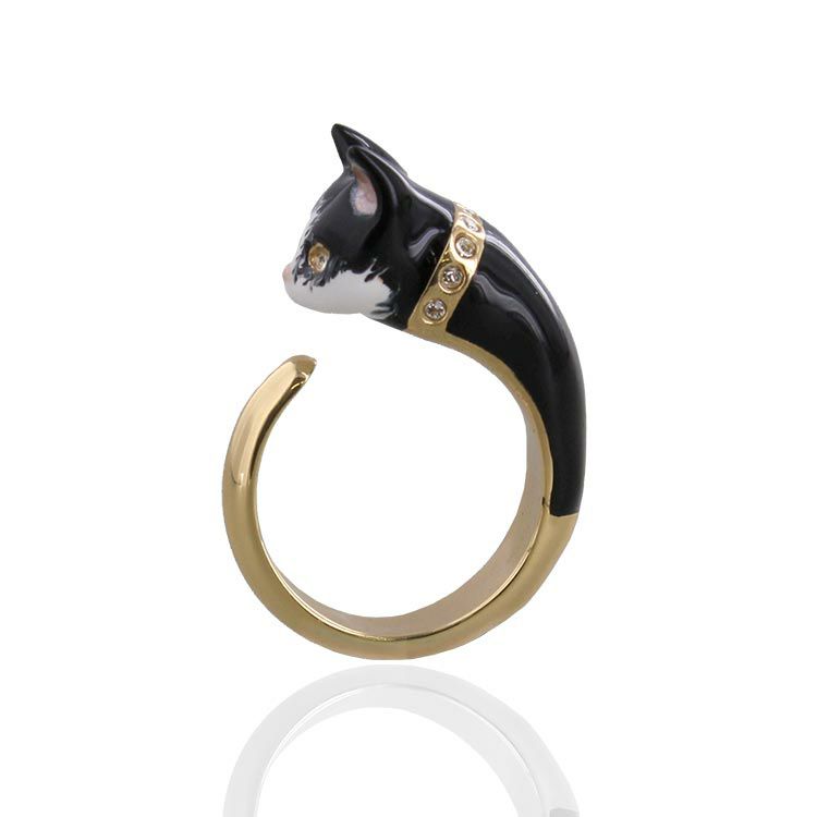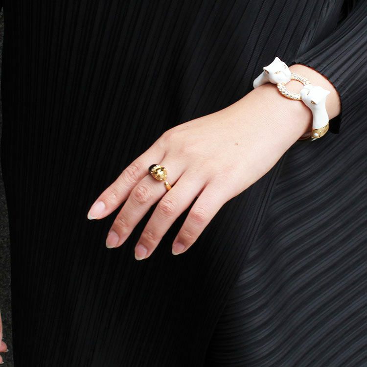 クリスタルガラスの瞳が輝くキャットモチーフが愛らしいリング。クラス感のある個性的なデザインなので、可愛らしくなりすぎずにモードな印象を与えてくれます。リング部分は厚みが控えめなので、違和感のない付け心地なのも嬉しいポイント。