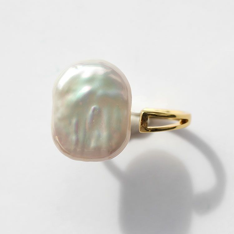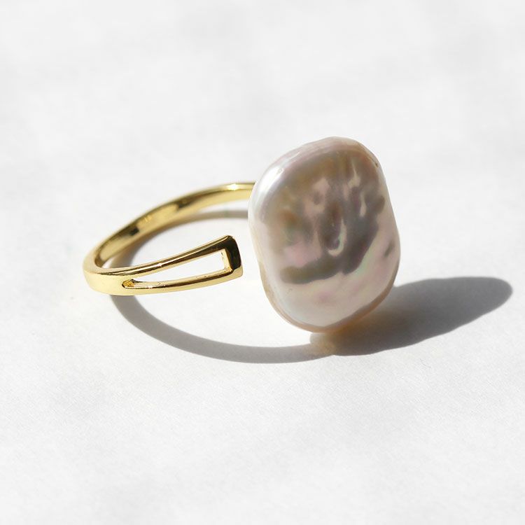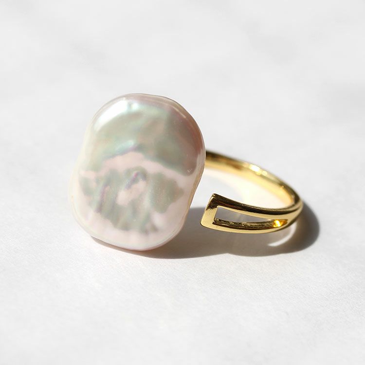 大ぶり平ドロップ型の淡水パールのデザインリング。やわらかい光沢感と天然ならではの色合いが洗練された大人のデザインになっています。パーティーシーンや会食、外出時、デイリー等幅広くご利用いただけます。