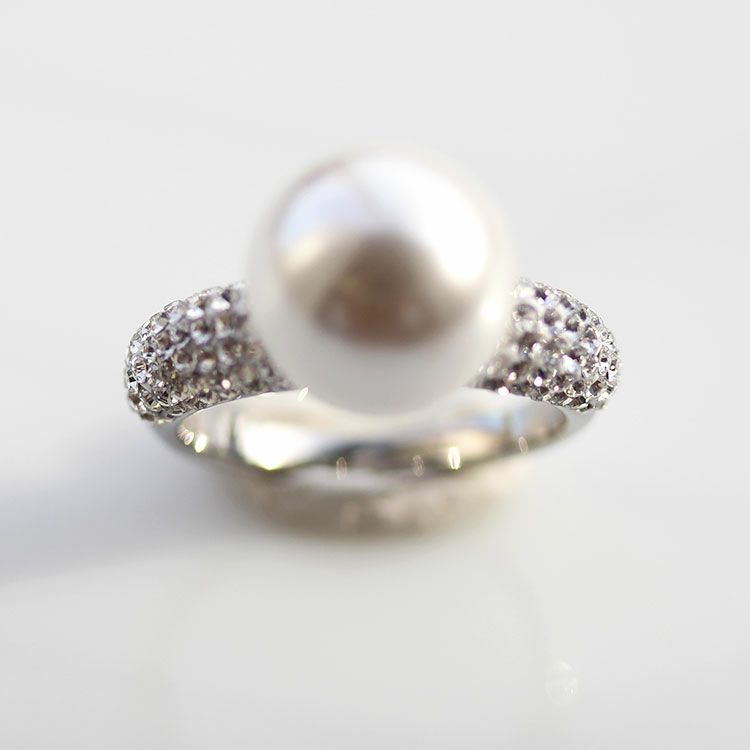 台座に大粒のパールがあしらわれているパールリング。リングにはチェコクリスタルがパヴェ状に敷き詰められ、大粒のパールがエレガントな印象をプラスし、大人の装いにしっくりとなじみます。