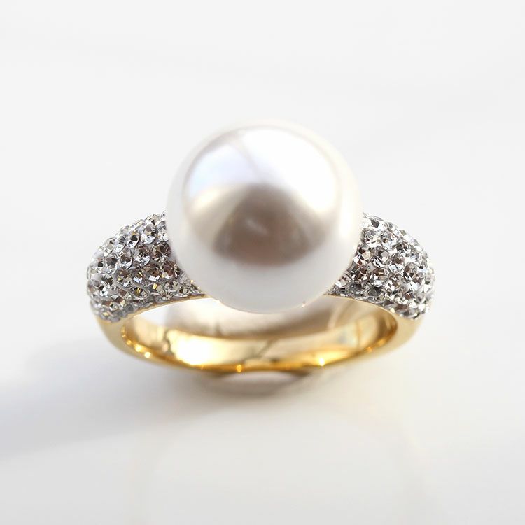 台座に大粒のパールがあしらわれているパールリング。リングにはチェコクリスタルがパヴェ状に敷き詰められ、大粒のパールがエレガントな印象をプラスし、大人の装いにしっくりとなじみます。