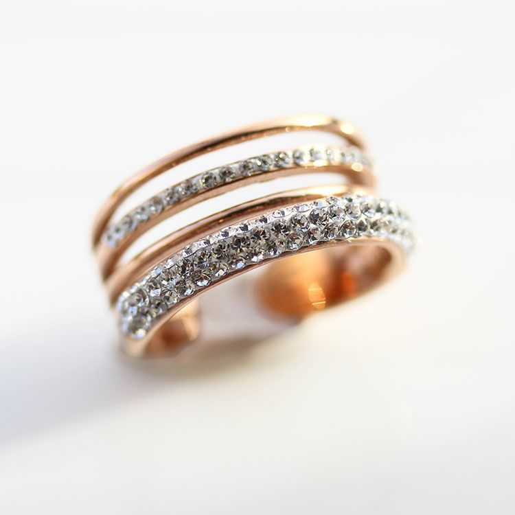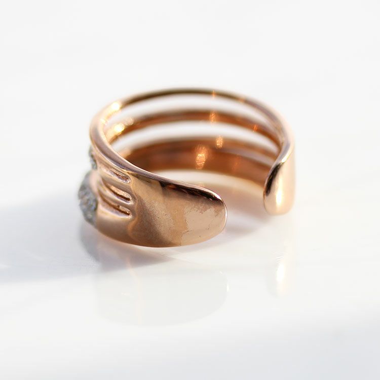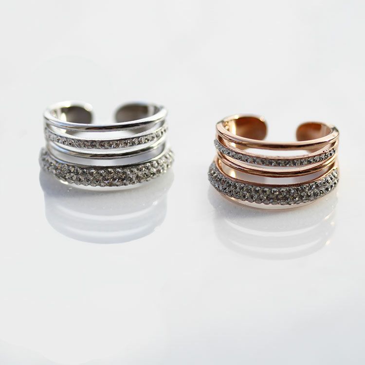 リングが5連配置されたデザインリング。パヴェ状にクリスタルガラスが敷き詰められ存在感あるフォルムは、パーティシーンやお出かけコーデを引き立ててくれます。