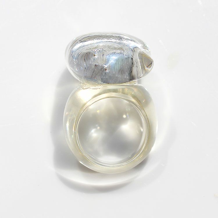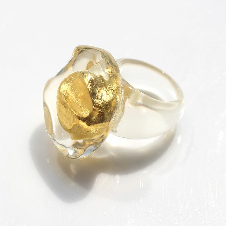 アートのような変形したフォルムがニュアンスのあるレジンリング。キラキラと光を反射するレジンに銀箔、金箔がアクセントになって、ラグジュアリーで、モードな雰囲気を印象付けています。どの角度から見てもこなれ感あるデザインは、デイリー使いはもちろん、パーティーシーンにもおすすめです。